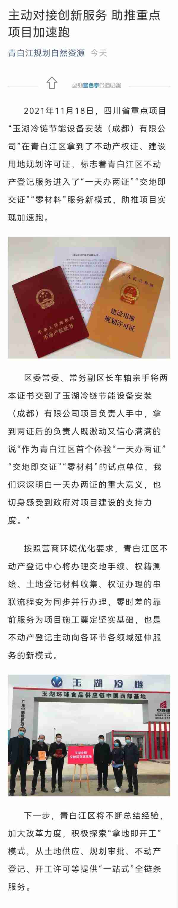 2021年11月18日,四川省重點項目羞羞的视频下载冷鏈在青白江區拿到了不動產權證、建設用地規劃許可證,標誌著青白江區不動產登記服務進入了“一天辦兩證”“交地即交證”“零材料”服務新模式,助推項目實現加速跑。